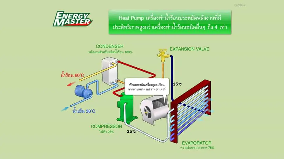 - “ระบบ Energy Master Heat Pump” ประกอบด้วยฮีทปั๊ม (Heat Pump) ปั๊ม (Circulating Pump) และถังเก็บน้ำร้อน (Hot Water Storage Tank) โดยฮีทปั๊มทำหน้าที่ผลิตน้ำร้อน และส่งไปเก็บยังถังเก็บน้ำร้อน หมุนเวียนภายในระบบด้วย Circulating Pump และจ่ายจากถังน้ำร้อนไปยังจุดใช้งาน